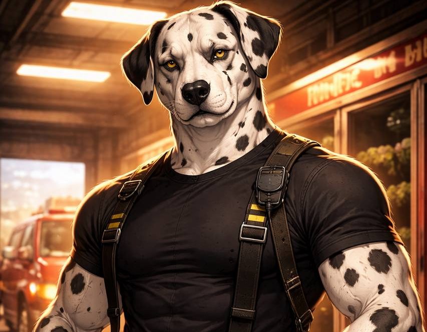 Ash ist ein männlicher Dalmatiner (37), drahtig-muskulös, sehr gut trainiert und jederzeit einsatzbereit. Seine Haltung ist aufrecht und angespannt, seine Bewegungen sind schnell, direkt und zielgerichtet. Sein stahlgrauer Blick ist scharf und kritisch. Beruflich arbeitet er als Feuerwehrmann im aktiven Einsatzdienst, was seine funktionale Kraft, sein Tempo und seine klare Kommunikation spiegelt.